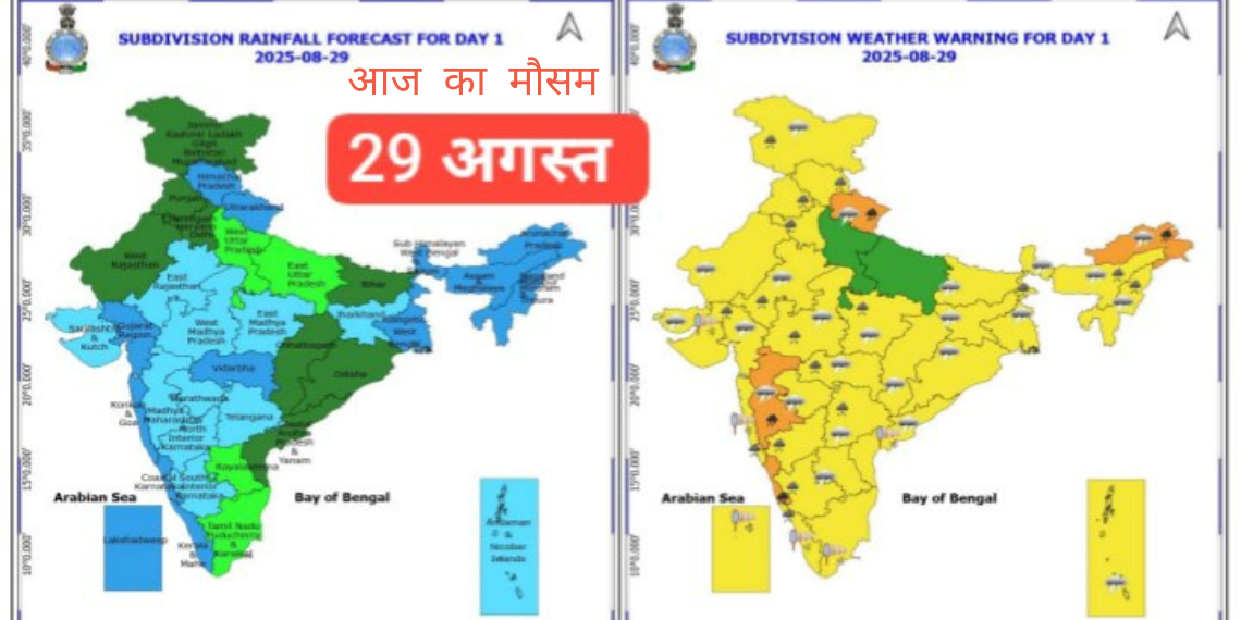भारतीय मौसम विभाग (IMD) ने 29 अगस्त के लिए पूरे भारत में मौसम की स्थिति को लेकर एक विस्तृत चेतावनी जारी की है। विभाग के पूर्वानुमान के अनुसार, आने वाले दिनों में देश के अलग-अलग हिस्सों में भारी बारिश, तूफानी हवाओं और गरज के साथ छींटे पड़ने की संभावना है, जिससे जनजीवन पर सीधा असर पड़ सकता है।